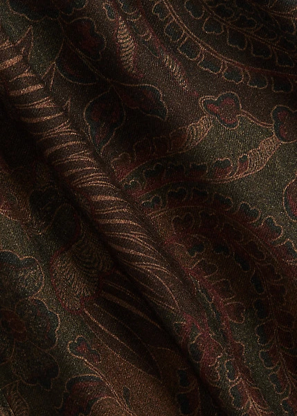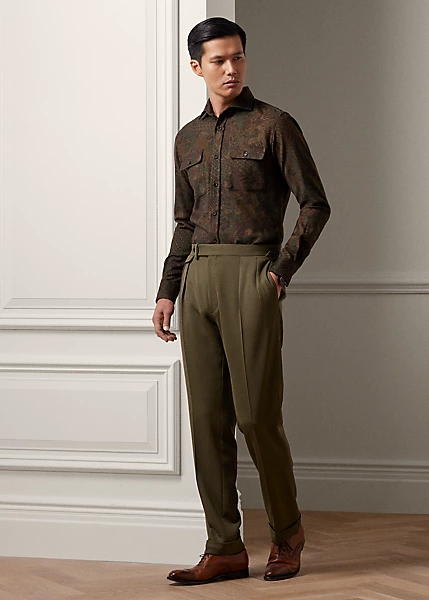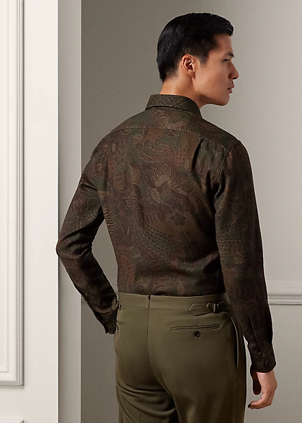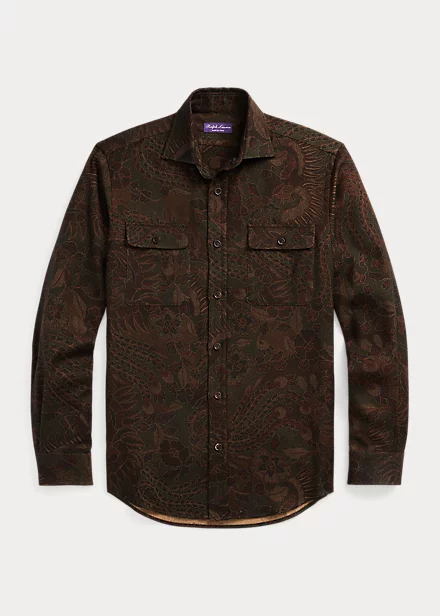 Cette chemise est confectionnée en Italie dans une laine imprimée d’un somptueux motif cachemire. Outre des boutons en corne véritable, elle est brodée de l’inscription « Ralph Lauren » sur la sous-patte.