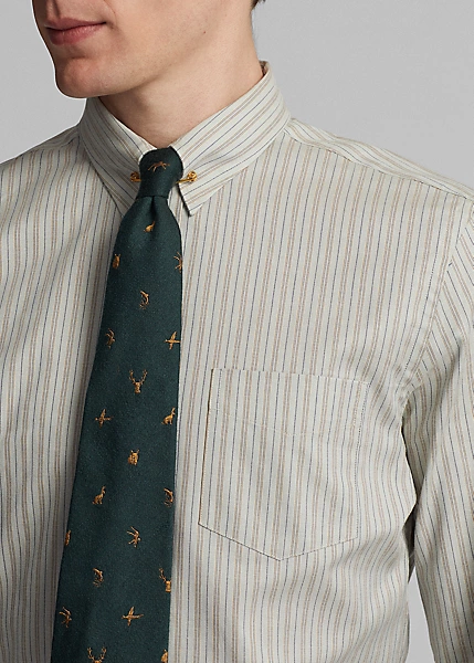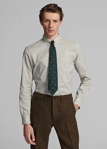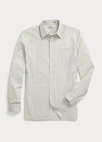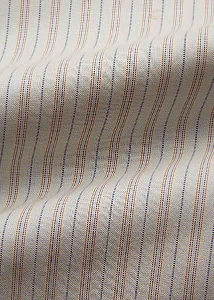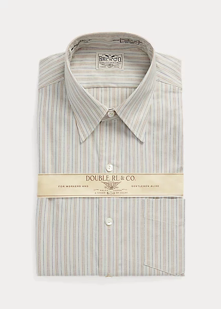 Cette chemise cintrée est confectionnée en coton tissé léger. Motif rayé teint en fil. Col à pointes de style vintage. Poche appliquée sur le côté gauche de la poitrine. Boutons en nacre véritable.