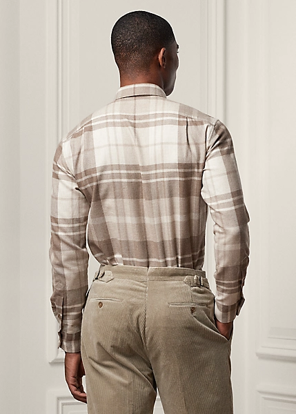 Rehaussée d’un motif écossais créé en exclusivité pour Ralph Lauren, le tissu léger de cette chemise est tissé en exclusivité par la filature anglaise Joshua Ellis. Le sergé se compose de laine raffinée, de soie naturelle et de cachemire pour un somptueux toucher.