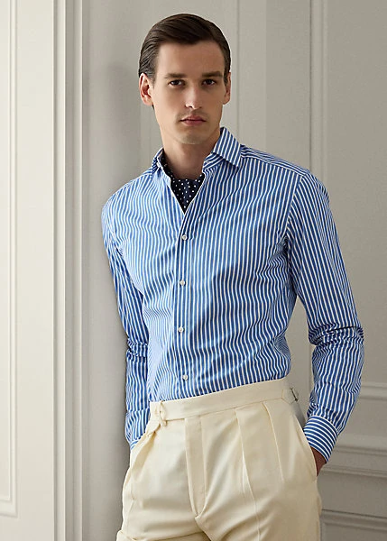 Cette chemise en coton confectionnée en Italie arbore des couleurs et des rayures créées en exclusivité pour Ralph Lauren Purple Label.