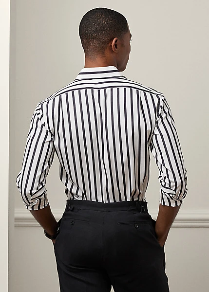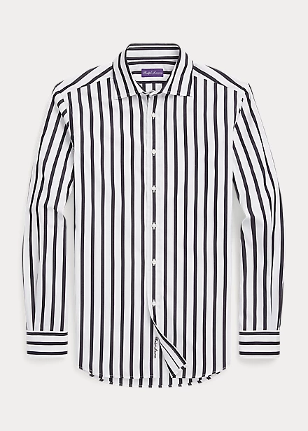 Spécialement traitée pour plus de douceur, cette chemise rayée est confectionnée en Italie dans une popeline de coton à fils doubles de qualité 120s créée en exclusivité pour Ralph Lauren Purple Label.