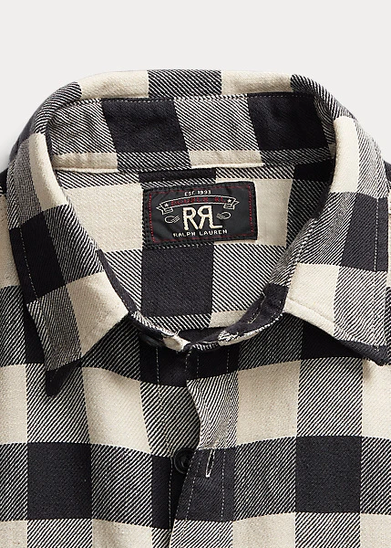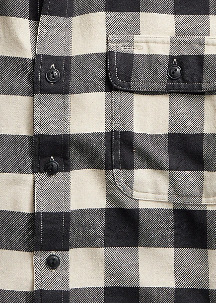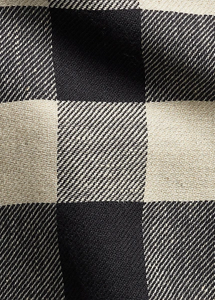 Modèle confectionné en sergé de coton et de lin à carreaux Buffalo. Confection authentique au point de chaînette sur les coutures latérales. Renforts en mousseline à l’intérieur. Délavé afin d’obtenir un toucher et un aspect usés.