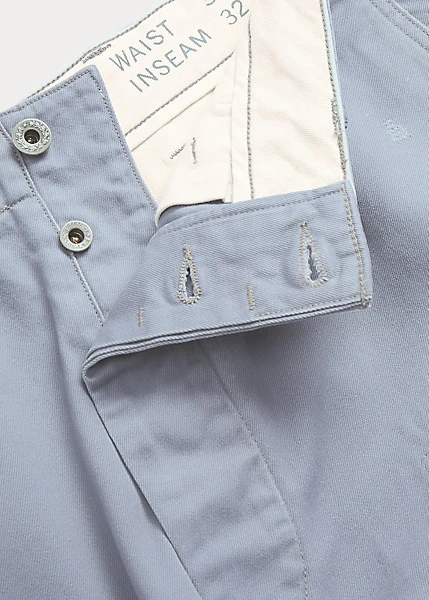 Pantalon classique en sergé de coton. Rapiécé en denim indigo japonais. Inspiré des pantalons militaires des années 1940.