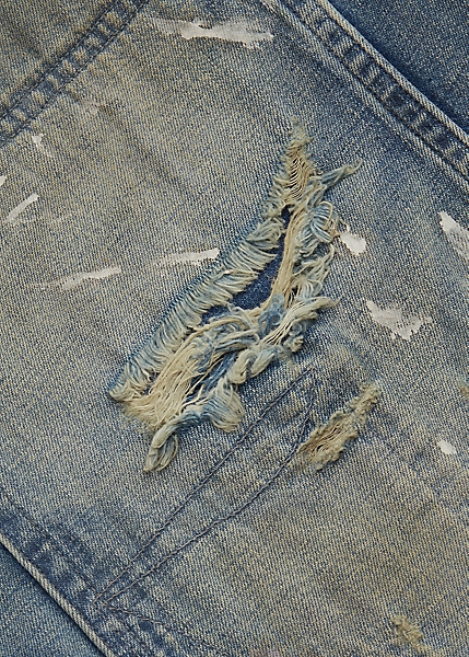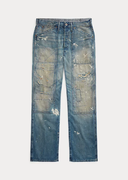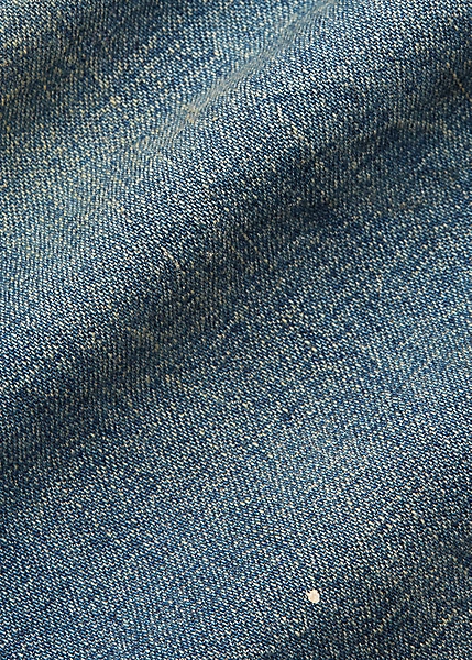 Pantalon de charpentier décontracté en denim japonais de coton et lin. Teint à l’indigo. Finitions inspirées des vêtements workwear des années 30. Fortement délavé et vieilli avec taches de peinture. Boucle réglable au dos. Sanforisé® pour minimiser le rétrécissement.