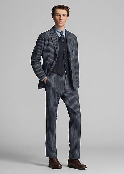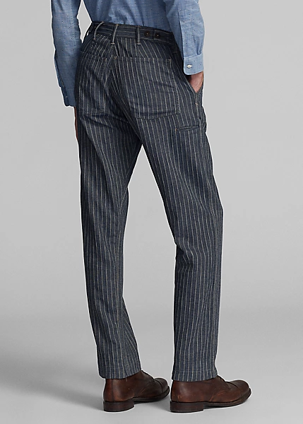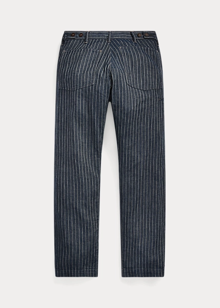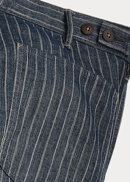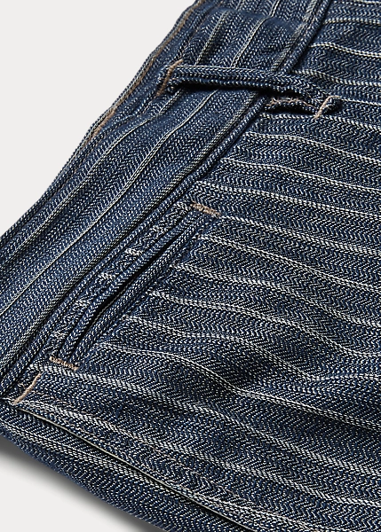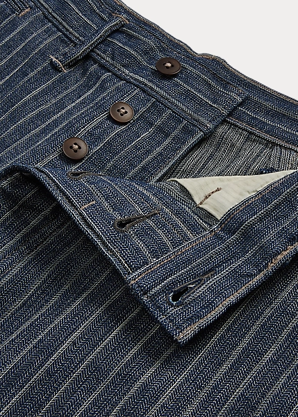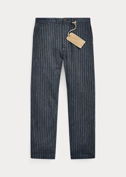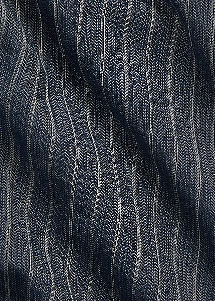 Pantalon ajusté à jambe droite. Confectionné en coton et lin rayés japonais à chevrons. Teint en fil à l’indigo et délavé. Boutons Corozo.
