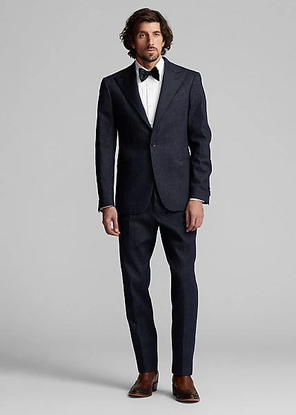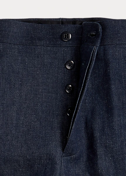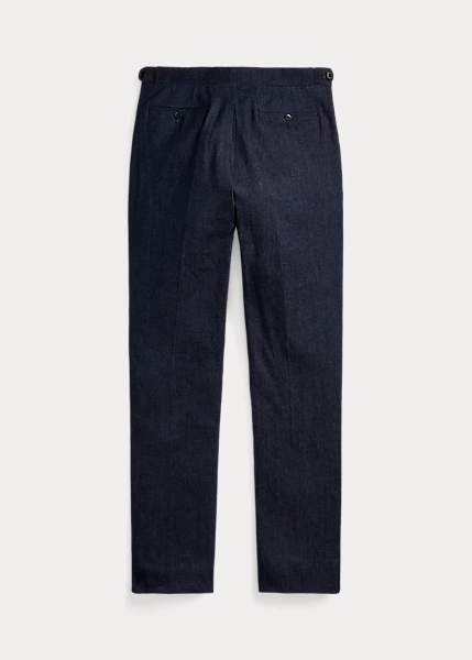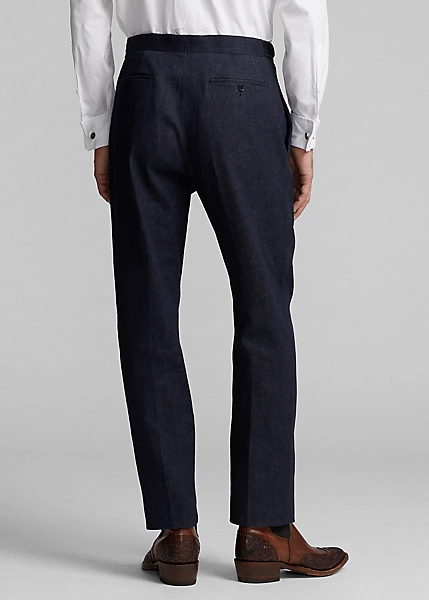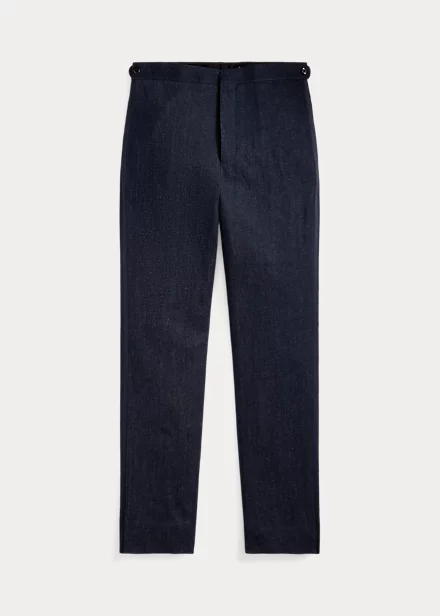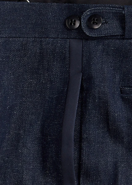 Pantalon slim confectionné en Italie. Denim stretch japonais tissé à partir de coton, lin et ramie. Teint à l’indigo. La rayure sur le côté extérieur de chaque jambe est confectionnée en satin marine provenant d’une filature anglaise centenaire.