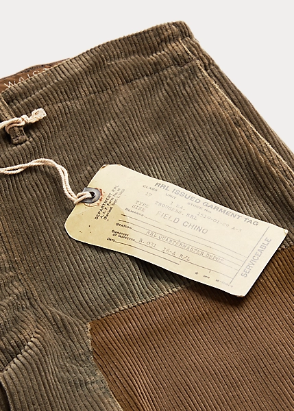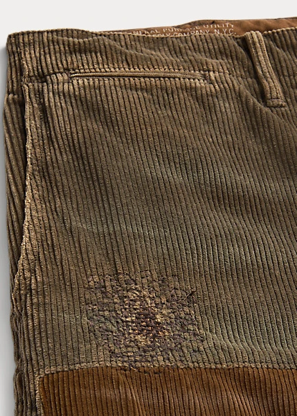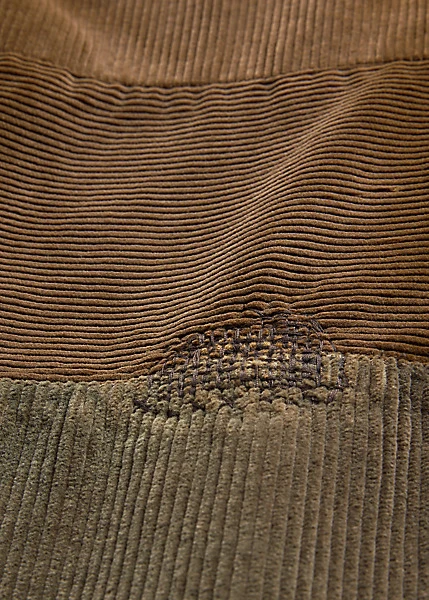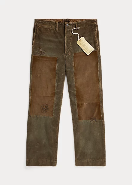 Pantalon coupe classique en velours de coton à côtes larges. Le tissu a été créé en exclusivité par une filature française de renom spécialisée dans le velours côtelé. Rapiéçages d’inspiration workwear française. Patchs contrastés en velours côtelé. Inspiré des pantalons militaires des années 1940. Délavé pour plus de douceur.