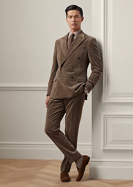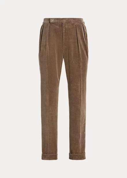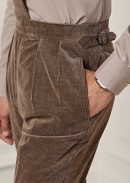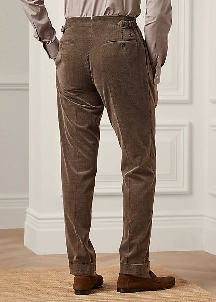 Confectionné à la main en Italie, ce pantalon de costume à pinces est réalisé dans un magnifique velours côtelé mélangé à un coton et un cachemire raffinés. Cette association de fibres somptueuse crée un effet chiné et une texture exquise.