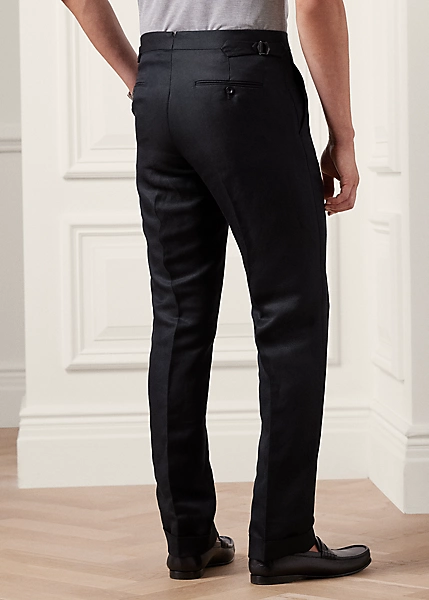 Ce pantalon sans pinces est confectionné à la main en Italie dans un tissu texturé créé en exclusivité pour Ralph Lauren. Ce somptueux tissu allie lin léger et soie naturelle douce.