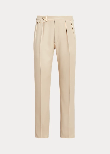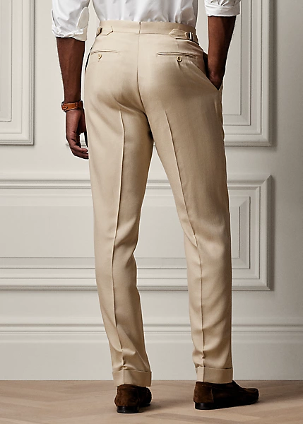 Ce pantalon en gabardine est confectionné à la main en Italie dans un mélange de soie naturelle décliné dans une élégante couleur sable créée en exclusivité pour Ralph Lauren Purple Label.