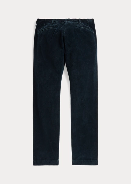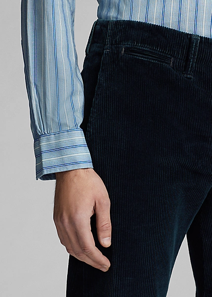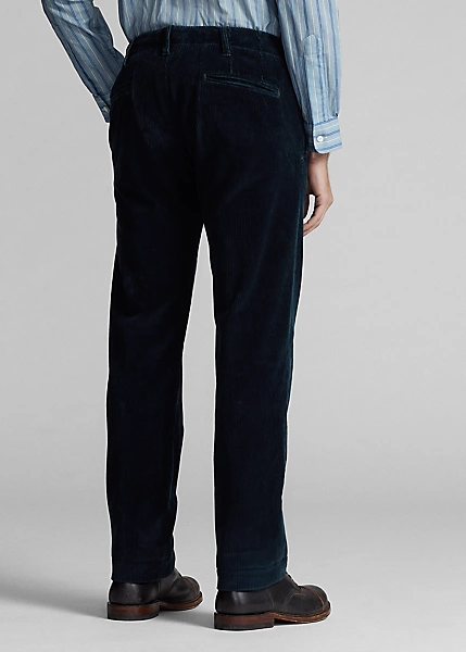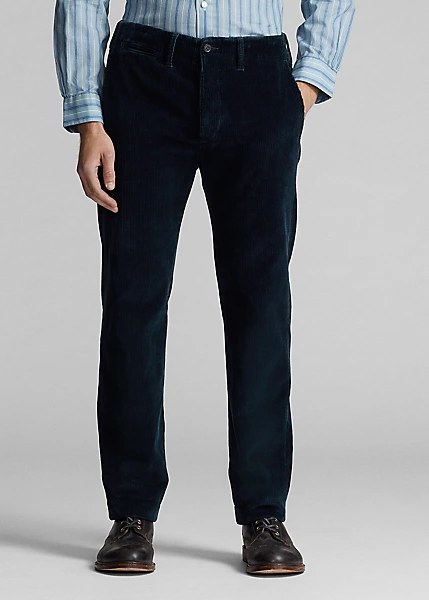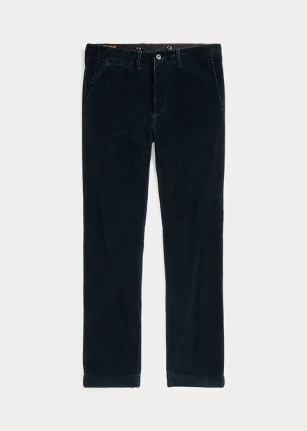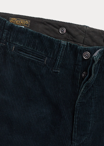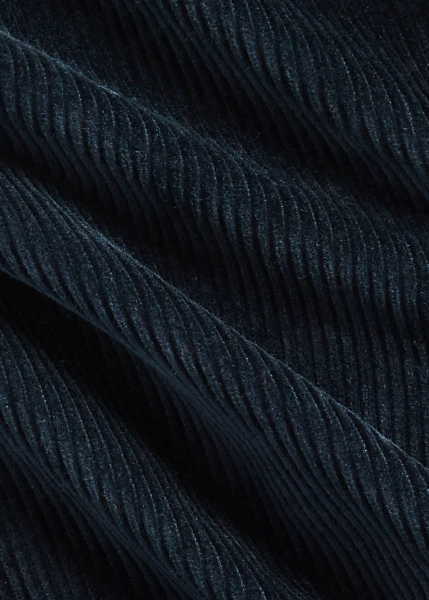 Pantalon ajusté en velours de coton japonais à larges côtes. Teint à l’indigo et délavé. Boutons Corozo.