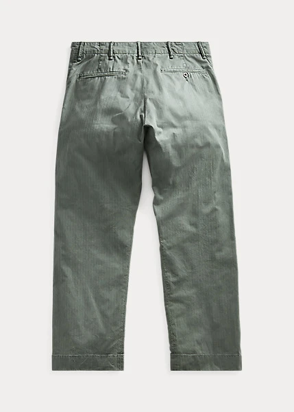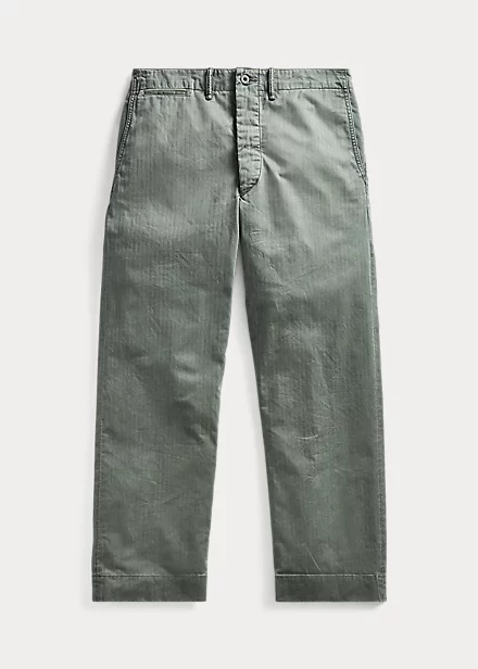 Pantalon à la coupe classique confectionné en coton à chevrons. Délavé et poncé à la main pour une apparence vintage authentique.
