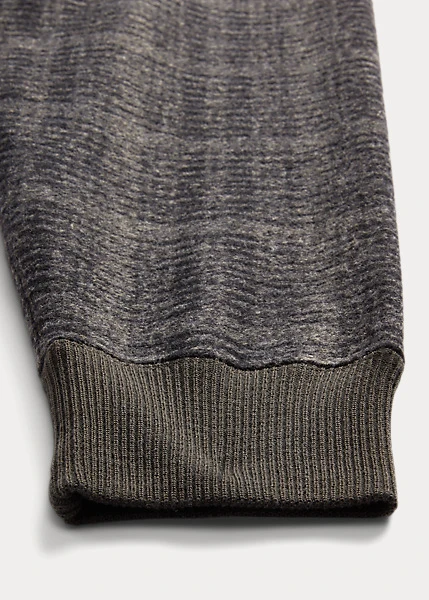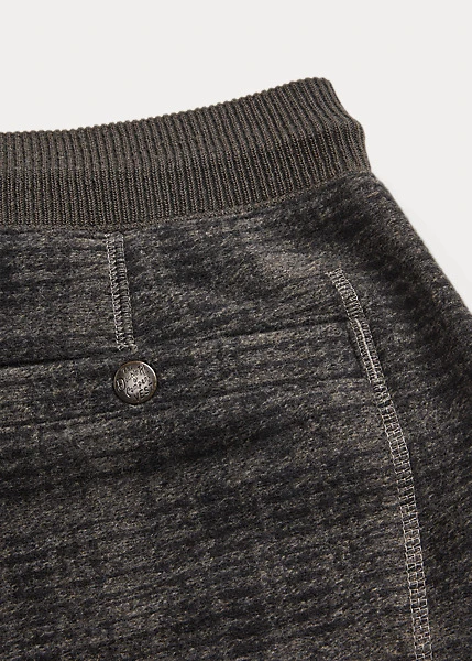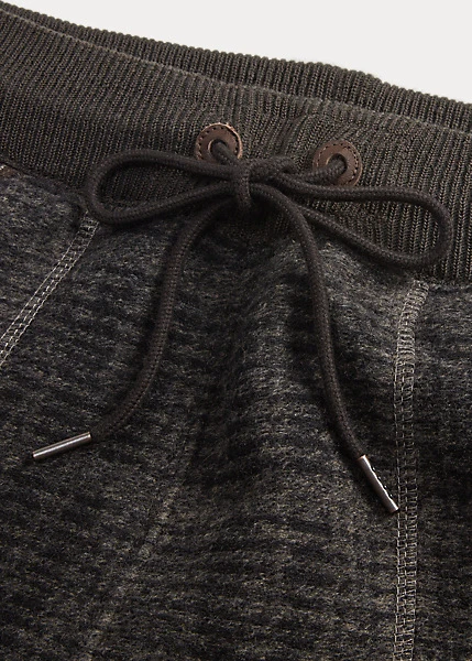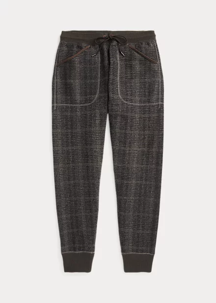Modèle confectionné en jacquard à maille double. Motif écossais. Taille côtelée à cordon de serrage avec renforts en cuir. Poches avant avec piqûres de renfort. Bas de jambe côtelés.