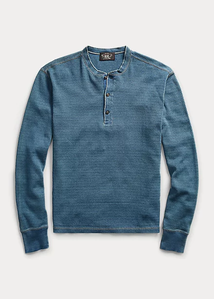 T-shirt Henley léger confectionné en tricot double de coton jacquard. Teint à l’indigo véritable et rincé pour un look usé.