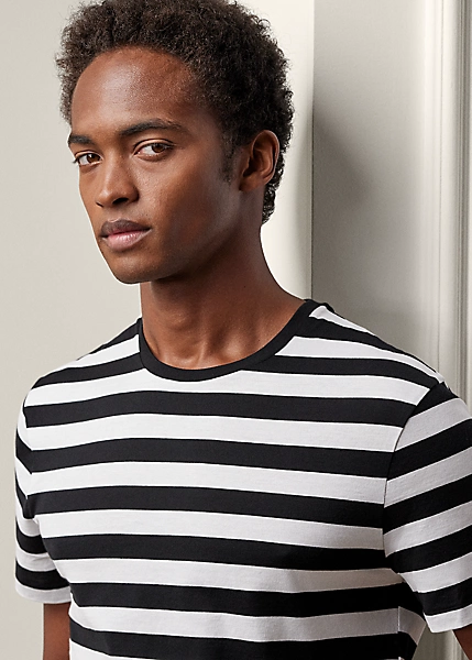 Ce t-shirt rayé est confectionné à partir de fil d’Écosse de coton de qualité supérieure lavé pour accentuer sa texture douce.